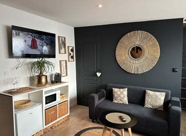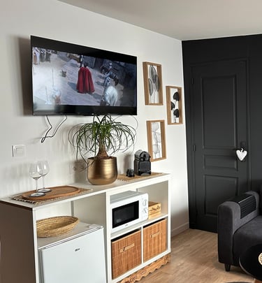 Détendez-vous dans notre coin salon, équipé d'une TV connectée, d'un réfrigérateur et d'un micro-ondes.