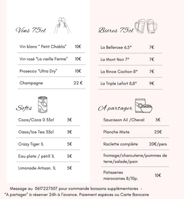 Explorez notre carte de boissons et planches, parfaites pour accompagner cette pause détente.
