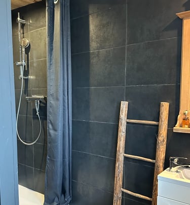 Un espace salle de douche avec tous les produits nécessaires : shampoing, gel douche et s.cheveux
